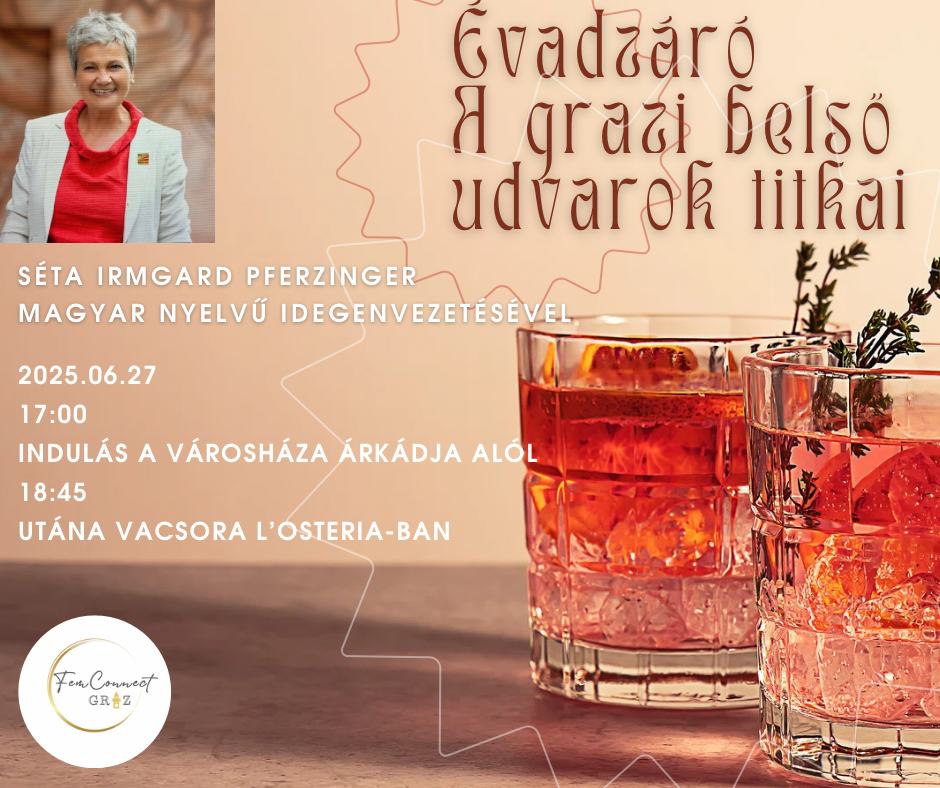 A nyári szünet előtt egy szuper évadzáró programra vártunk titeket! A Városháza árkádjai alatt találkoztunk 17 órakor, amikor is Irmgard Pferzinger helyett Éva Frisinghelli, magyar idegenvezető egy nagyon különleges sétára invitált minket, olyan titkos zugokat mutatott meg nekünk és hozzá történeteket mesélt el, amelyeket grazi lakosként sem valószínű, hogy mindenki ismert. A séta után a L’Ostería teraszán vacsoráztunk, beszélgettünk, és ezzel a kellemes esttel zártuk az évadot, hogy aztán szeptembertől újult erővel futhassunk neki a következő programoknak.